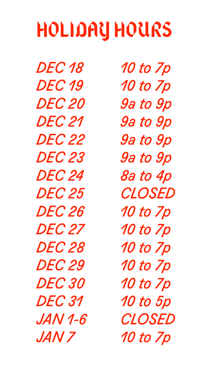 We are open until 9pm the next two evenings and then until 4p on Christmas Eve. See you at the shop :)